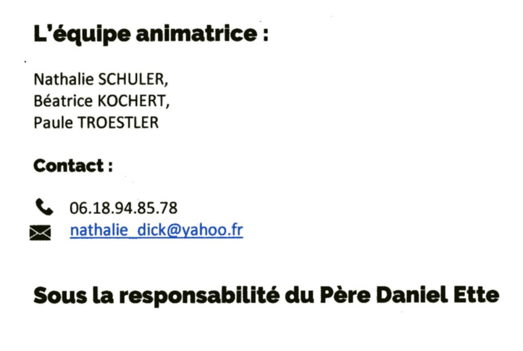 | Presbytère St Jean Baptiste 2 rue de l’École 67380 LINGOLSHEIM Téléphone : 03 88 78 16 45 – Courriel : nddessables@hotmail.com |